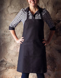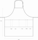 Tablier 32”L x 34”I. Six poches dont deux conçues pour crayons et/ou limonadier. Système d'ajustement à anneaux de métal argenté.