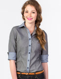 Chemise ajustée à manches 3/4 ayant de jolis détails contrastants à carreaux bleu et blanc. Boutons contrastants.