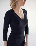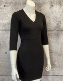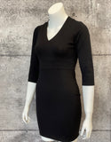 Cette robe parfaitement ajustée comporte une encolure en V et des manches trois-quarts.